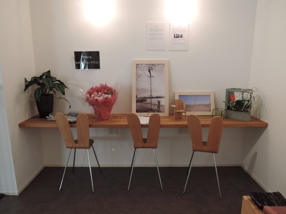 お出迎えデスクには花束とご芳名帳。ぜひ何か落書きを−とお願いしたら、早速。